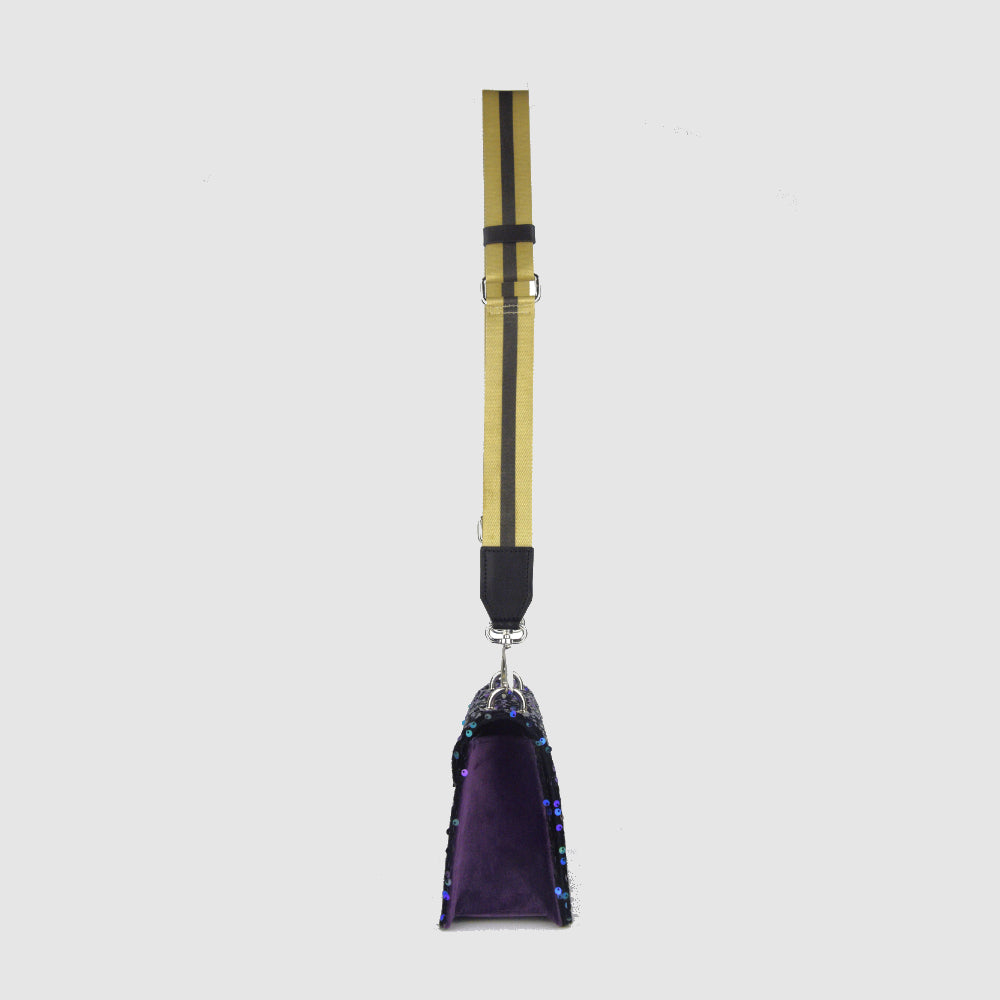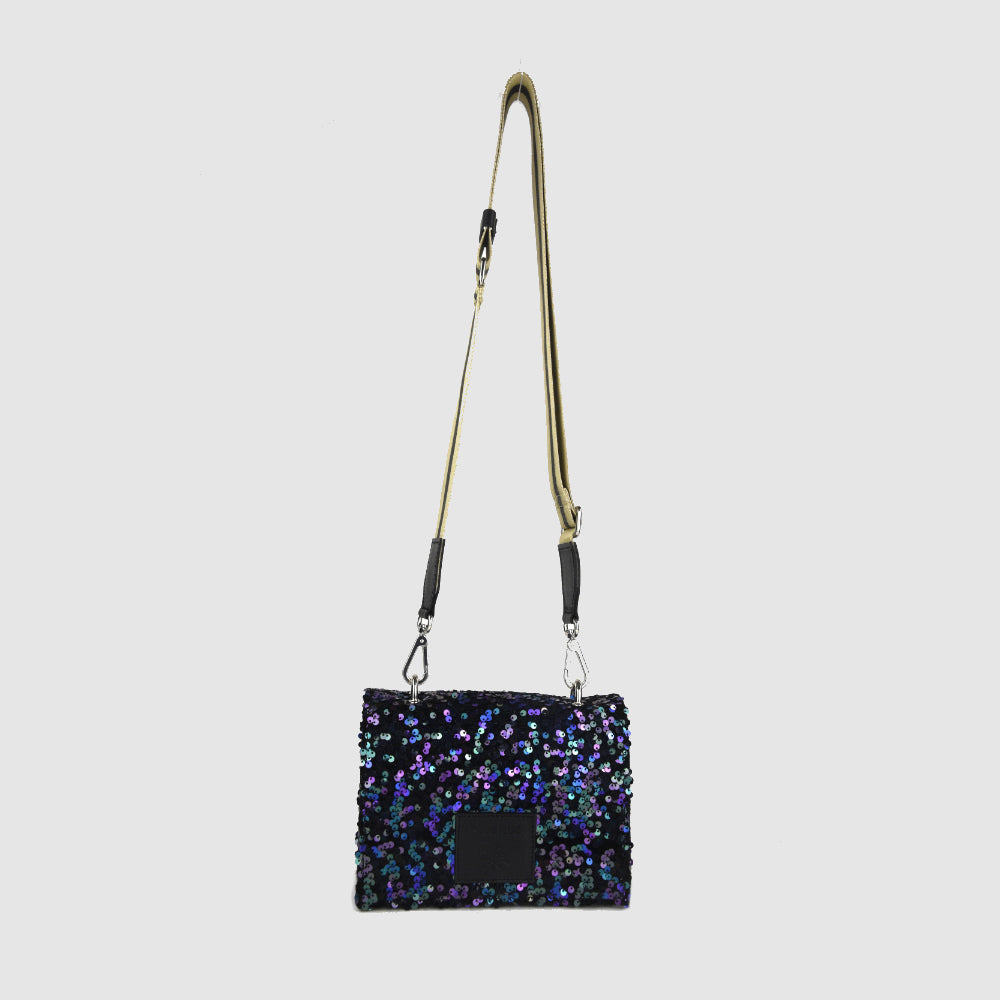 Innen schützt ein weiches Baumwollfutter deine Essentials, außen sorgt der dezent glitzernde Stoff für einen besonderen Auftritt. Der verstellbare Gurt macht die Tasche vielseitig tragbar.